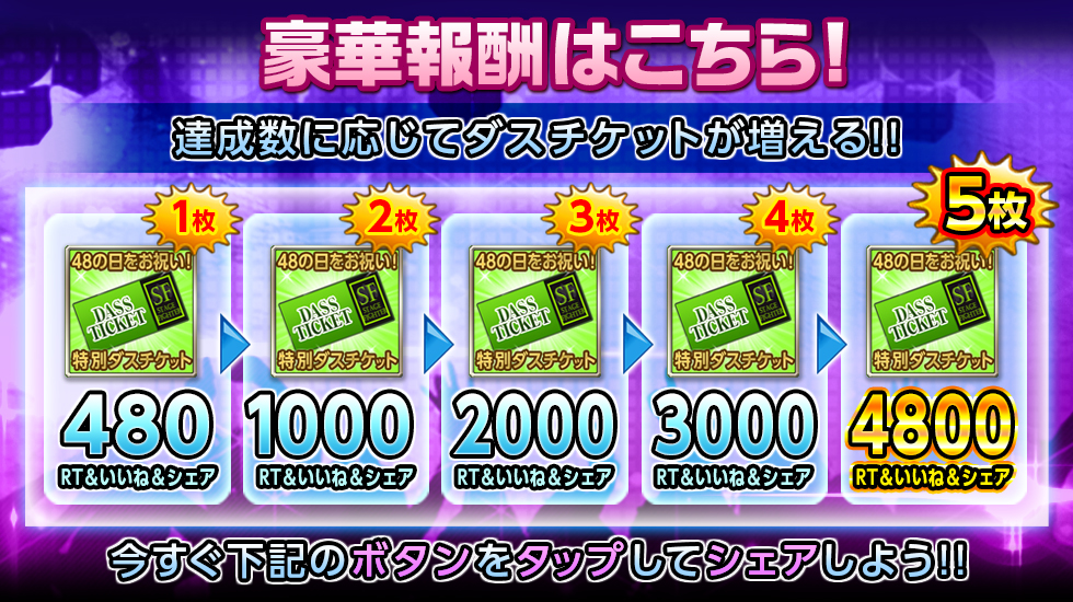 シェア数に応じて決まった報酬の特別ダスチケットは、ログインボーナス形式で1日1個を上限にお受け取りいただけます。