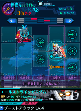 モビルスーツの特性を生かした配置・攻撃を意識しよう。たとえば遠距離タイプは遠くから攻撃をすることができるが、近くに接近されると攻撃ができなくなるなど、こまかいところにも本格的な設定が存在する。バトルをするたびに新たな発見をみつけてほしい。